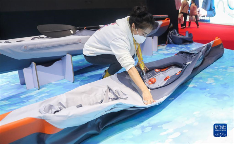 工作人員在第三屆中國國際進(jìn)口博覽會消費(fèi)品展區(qū)的迪卡儂展臺演示可折疊皮劃艇如何安裝(2020年11月6日攝)。新華社記者 丁汀 攝