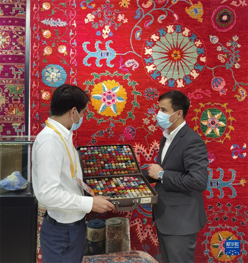 阿富汗參展商阿里·法伊茲(右)在第四屆中國國際進(jìn)口博覽會阿富汗手工羊毛地毯展臺忙碌(2021年11月5日攝)。新華社記者 吳宇 攝