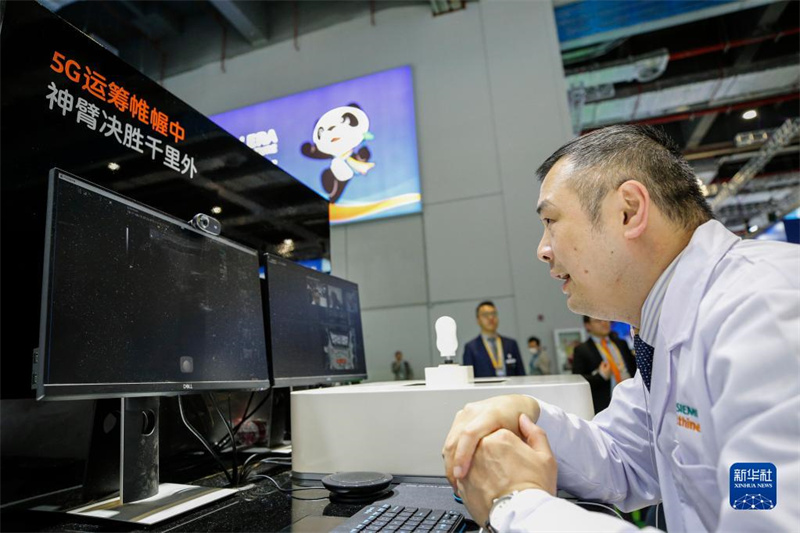 一位超聲科醫(yī)生在第二屆中國國際進(jìn)口博覽會上使用西門子5G醫(yī)療遠(yuǎn)程超聲解決方案,與重慶市彭水苗族土家族自治縣紹慶街道社區(qū)衛(wèi)生服務(wù)中心?的超聲醫(yī)生進(jìn)行遠(yuǎn)程實(shí)時(shí)高清超聲圖像傳輸和音視頻對話(2019年11月6日攝)。新華社記者 張玉薇 攝