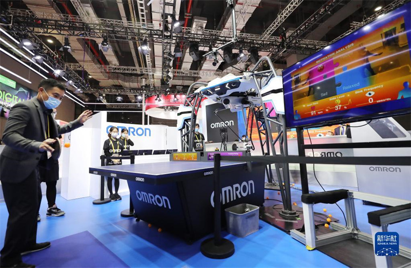 在第三屆中國國際進(jìn)口博覽會期間,一名男子體驗(yàn)與歐姆龍公司的一款乒乓球教練機(jī)器人對戰(zhàn),右側(cè)屏幕上實(shí)時(shí)顯示他的心率和情緒指數(shù)(2020年11月5日攝)。新華社記者 方喆 攝