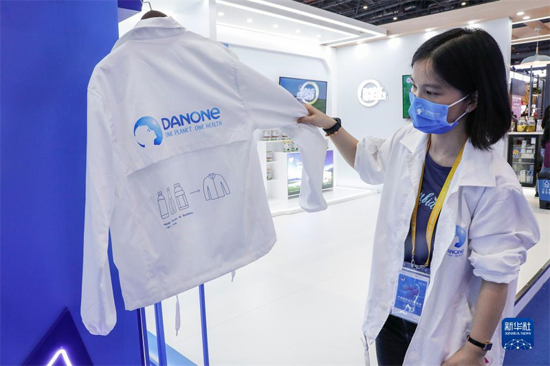 工作人員在第四屆中國國際進(jìn)口博覽會食品和農(nóng)產(chǎn)品展區(qū)達(dá)能展臺展示用塑料飲料空瓶制造的外套(2021年11月6日攝)。新華社記者 張玉薇 攝