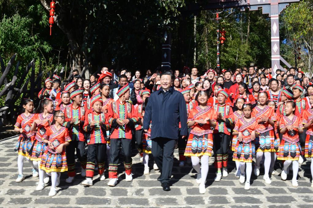 2020年1月19日至21日,習(xí)近平總書記來到云南,看望慰問各族干部群眾,向全國人民致以新春祝福。這是19日下午,騰沖市清水鄉(xiāng)三家村中寨司莫拉佤族村的鄉(xiāng)親們唱著《阿佤人民唱新歌》,簇?fù)碇?xí)近平總書記走出村口。新華社記者 謝環(huán)馳 攝