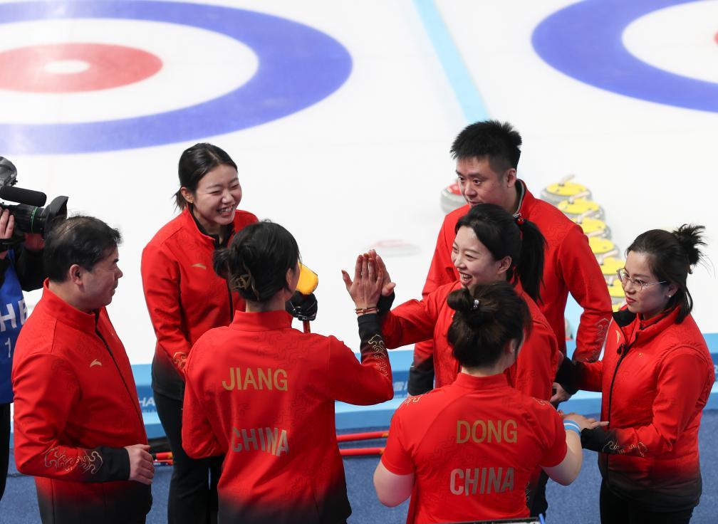 2月13日,中國冰壺隊教練和選手在比賽間隙相互鼓勵。新華社記者 胡星宇 攝