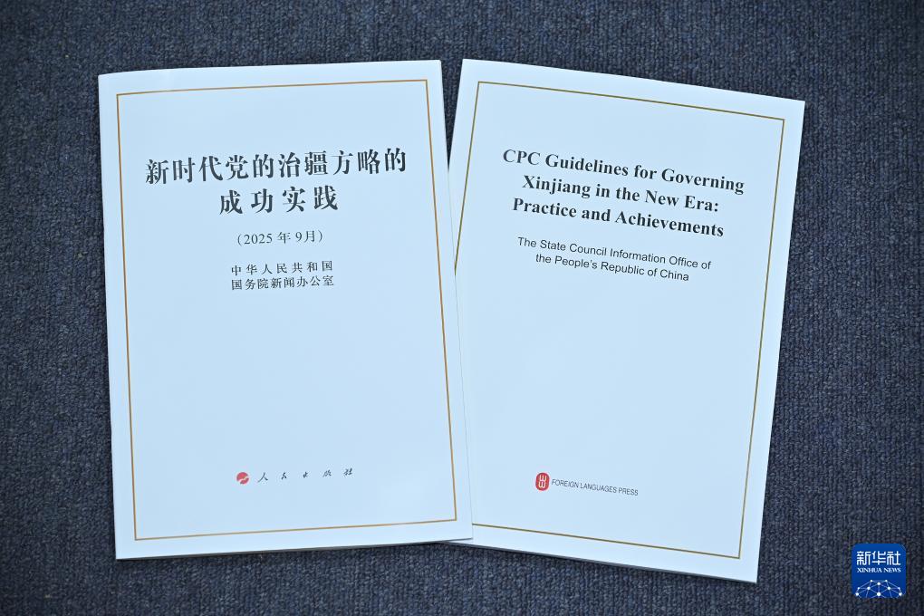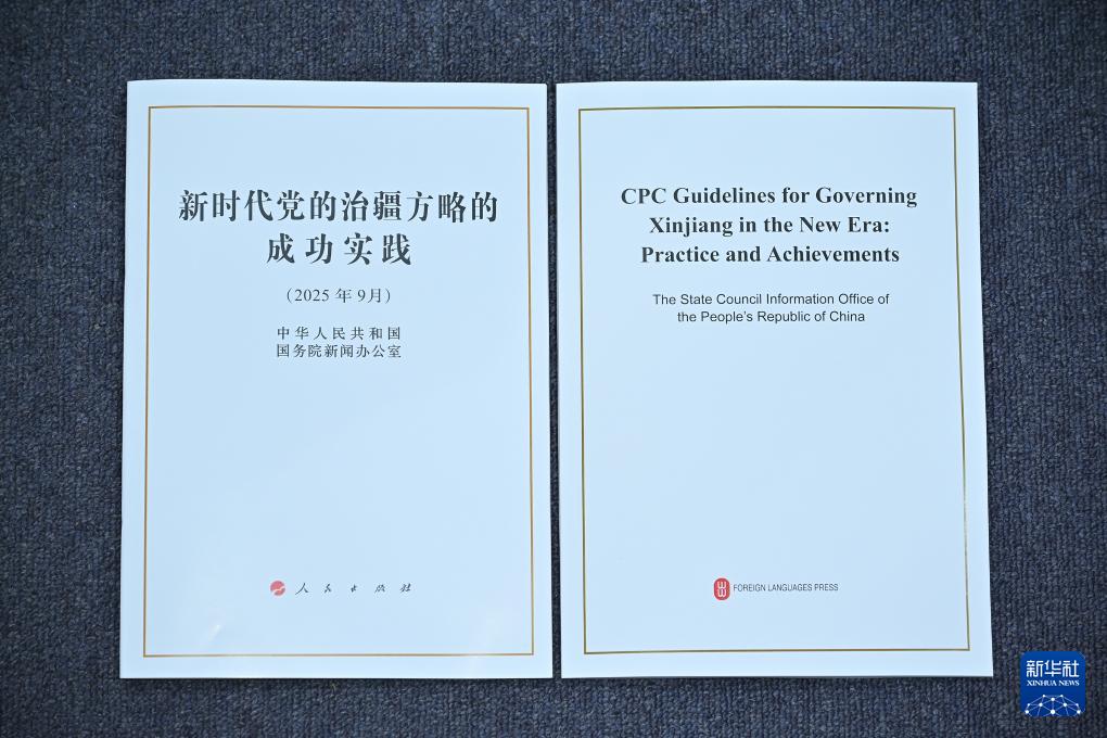 9月19日,國(guó)務(wù)院新聞辦公室在北京舉行新聞發(fā)布會(huì),發(fā)布《新時(shí)代黨的治疆方略的成功實(shí)踐》白皮書,中央宣傳部副部長(zhǎng)王綱,新疆維吾爾自治區(qū)黨委副書記、自治區(qū)主席艾爾肯·吐尼亞孜,新疆維吾爾自治區(qū)黨委常委、自治區(qū)常務(wù)副主席陳偉俊,新疆維吾爾自治區(qū)黨委常委、宣傳部部長(zhǎng)王建新出席,介紹白皮書有關(guān)情況并答記者問。這是《新時(shí)代黨的治疆方略的成功實(shí)踐》白皮書。新華社記者 李鑫 攝