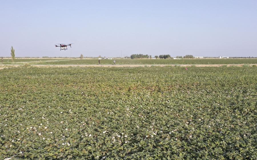 在新疆尉犁縣興平鎮(zhèn)達西村一處高標(biāo)準(zhǔn)農(nóng)田,種植戶用無人機噴灑脫葉劑(2022年9月20日攝,無人機照片)。新華社發(fā)(汪志鵬 攝)