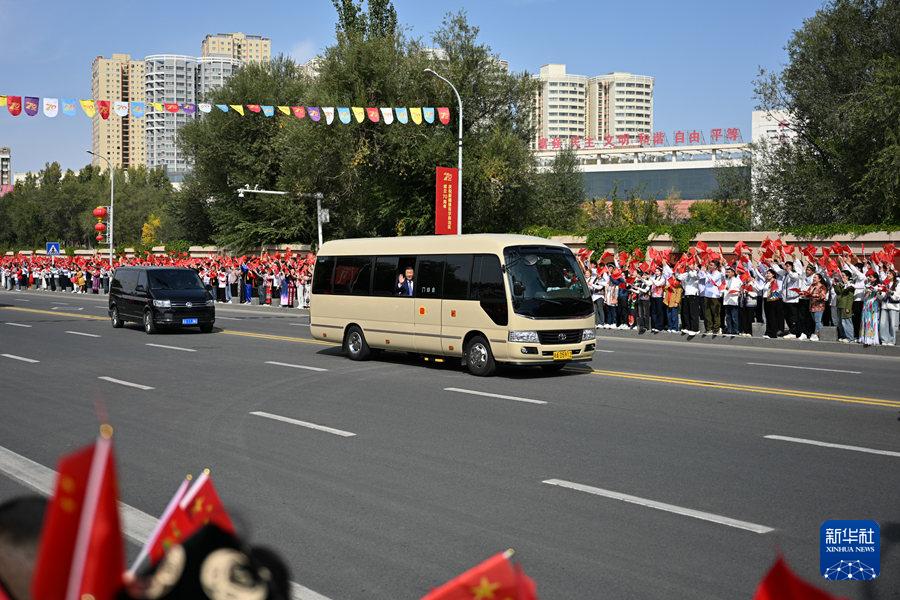 9月23日下午,中共中央總書記、國家主席、中央軍委主席習(xí)近平率中央代表團(tuán)乘專機(jī)抵達(dá)烏魯木齊,出席新疆維吾爾自治區(qū)成立70周年慶祝活動(dòng)。這是從機(jī)場(chǎng)到住地途中,習(xí)近平向沿途歡迎的群眾揮手致意。新華社記者 辛悅衛(wèi) 攝