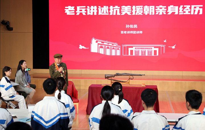 2021年10月25日,老兵代表在上海中學的課堂上講述抗美援朝的親身經(jīng)歷。這堂特別的思政課是中共一大紀念館“百物進百校,百講證百年”活動的第一講,紀念館從館藏中精選100件革命文物,帶進學校課堂,以“文物進校園”的形式,用好用活紅色資源,賡續(xù)紅色血脈。