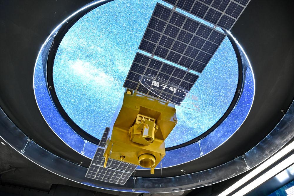 在位于安徽省合肥市的中電信量子信息科技集團有限公司科技體驗館內拍攝的“墨子號”量子衛(wèi)星模型(2025年7月1日攝)。新華社記者 張鋮 攝