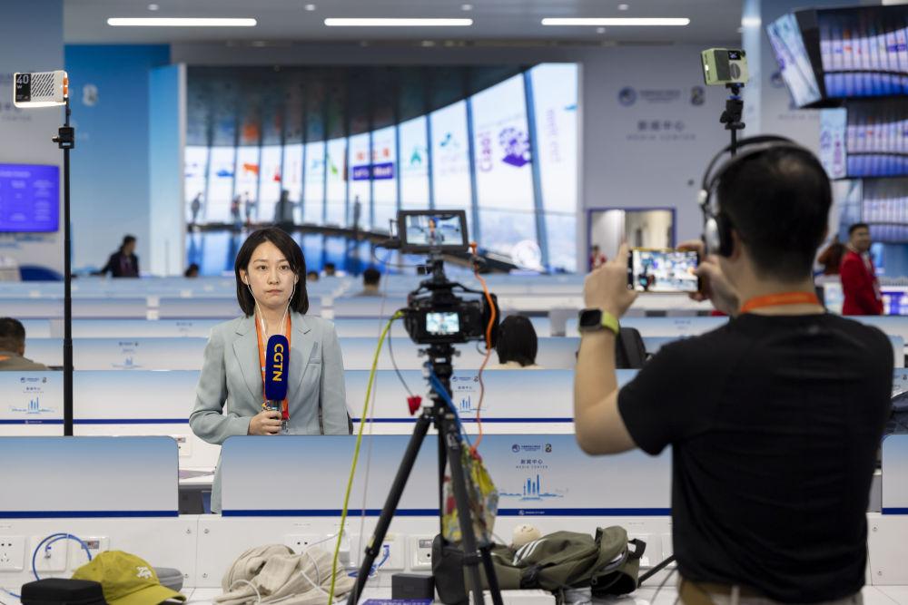 11月4日,媒體記者在第八屆進(jìn)博會(huì)新聞中心媒體工作間錄制出鏡視頻。新華社記者 王翔 攝