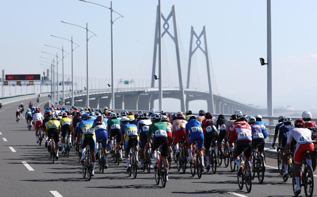 11月8日,參賽選手在港珠澳大橋騎行。當(dāng)日進(jìn)行的第十五屆全國運(yùn)動會公路自行車男子個人賽,賽道全程231.8公里,選手經(jīng)過港珠澳大橋,跨越粵港澳三地。這是全運(yùn)會歷史上首次舉辦跨境比賽。新華社記者 毛思倩 攝