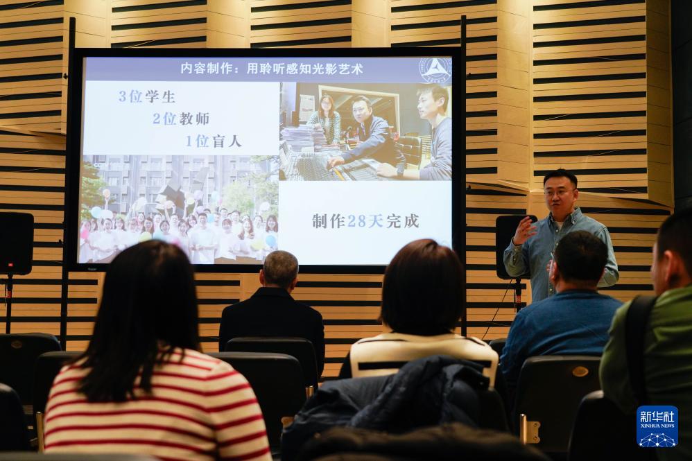 教師志愿者付海鉦在中國傳媒大學“光明影院”無障礙信息傳播實驗室為媒體介紹光明影院項目(12月1日攝)。新華社記者 謝晗 攝