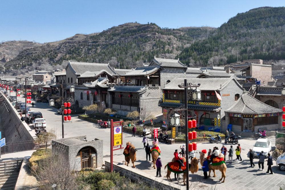 游客在山西省呂梁市臨縣磧口古鎮(zhèn)騎駱駝(2025年3月19日攝,無人機照片)。新華社記者 詹彥 攝