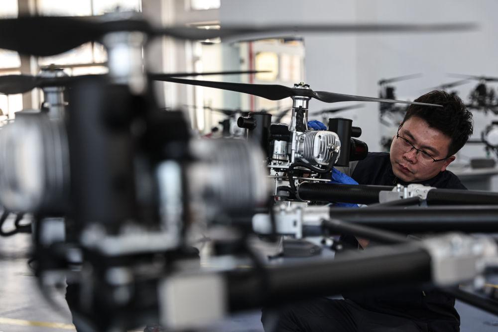 在遼寧省沈陽市沈北新區(qū)的優(yōu)選空天科工集團,工程師對一架待交付的應急消防無人機進行安全檢查(2025年4月25日攝)。新華社記者 潘昱龍 攝