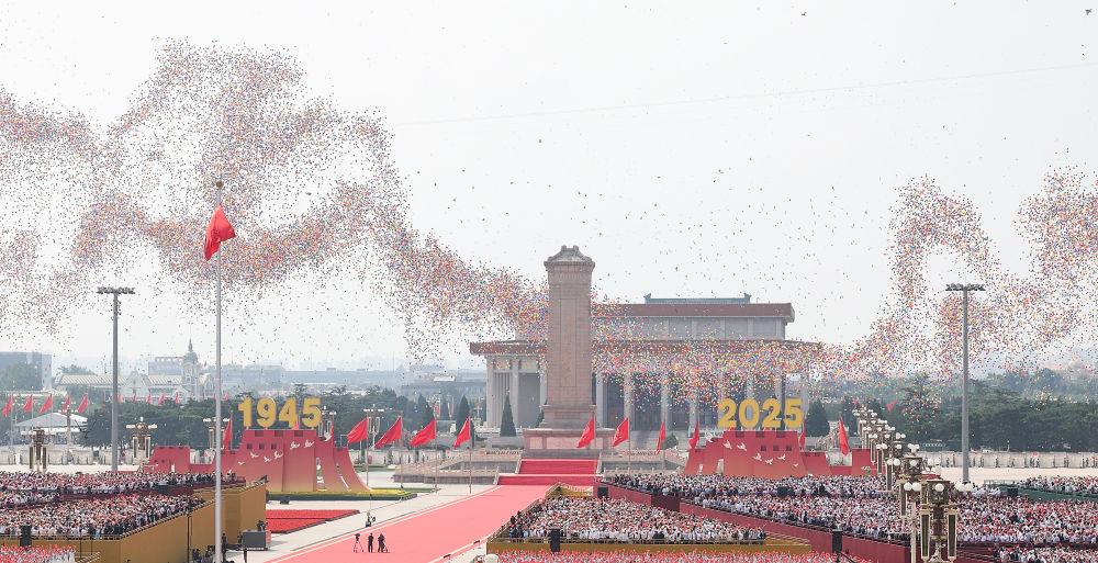 2025年9月3日,紀念中國人民抗日戰(zhàn)爭暨世界反法西斯戰(zhàn)爭勝利80周年大會在北京隆重舉行。這是紀念大會現(xiàn)場放飛和平鴿和氣球。新華社記者 姚大偉 攝