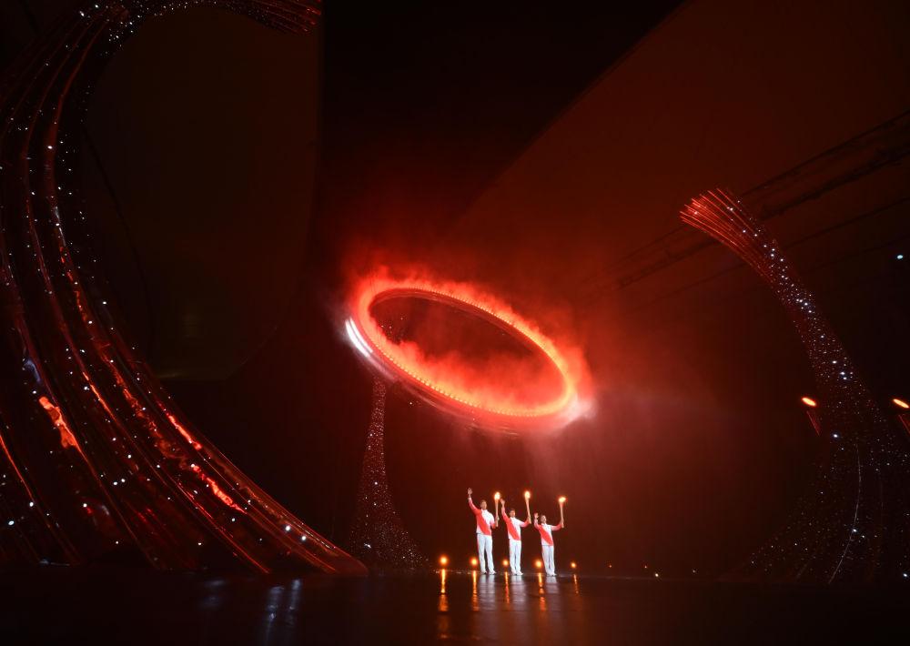 2025年11月9日,第十五屆全國運(yùn)動(dòng)會(huì)開幕式在廣東奧林匹克體育中心舉行。這是火炬手蘇炳添(中)、張家朗(左)、李祎點(diǎn)燃主火炬后向觀眾致意。新華社記者 肖藝九 攝