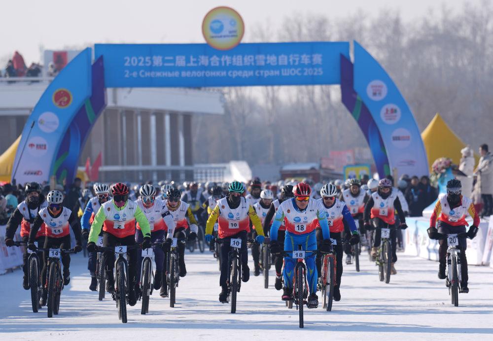 2025年1月11日,選手在哈爾濱太陽島風景區(qū)參加2025第二屆上海合作組織雪地自行車賽。