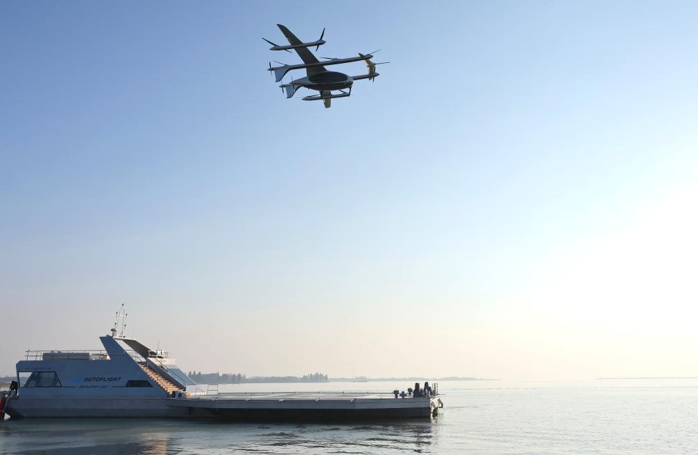 2025年11月22日,在江蘇昆山的峰飛航空全球科技日活動(dòng)中,一架電動(dòng)垂直起降飛行器從“水上機(jī)場”起飛。新華社記者 方喆 攝