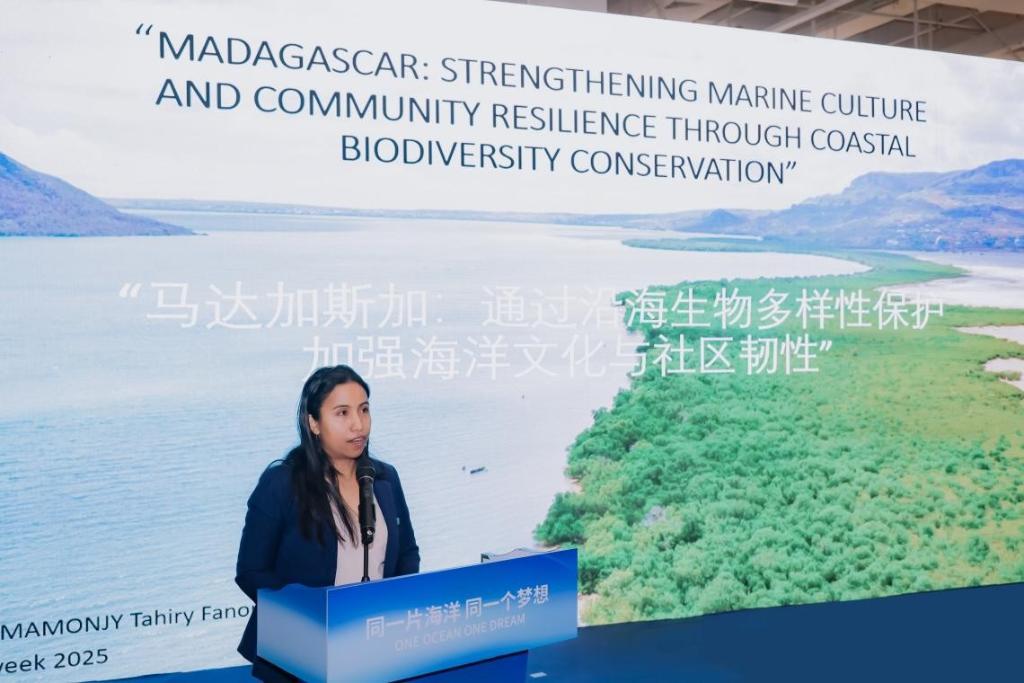 2025年10月29日,馬達(dá)加斯加環(huán)境與可持續(xù)發(fā)展部官員塔希里·拉庫(kù)圖馬蒙吉在2025中國(guó)海洋經(jīng)濟(jì)博覽會(huì)活動(dòng)中發(fā)言。(國(guó)際紅樹林中心供圖)