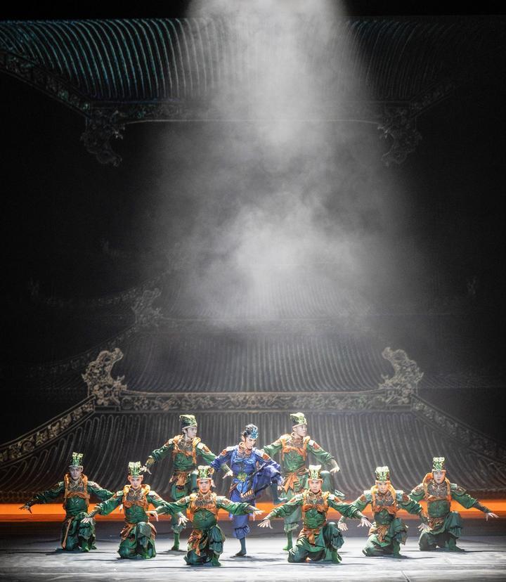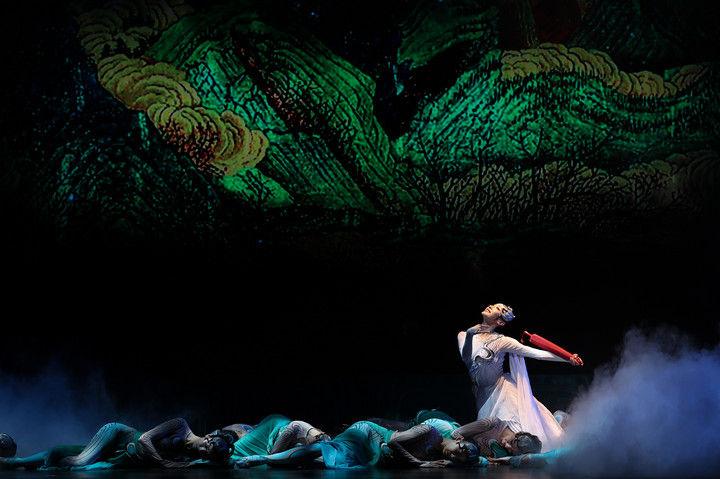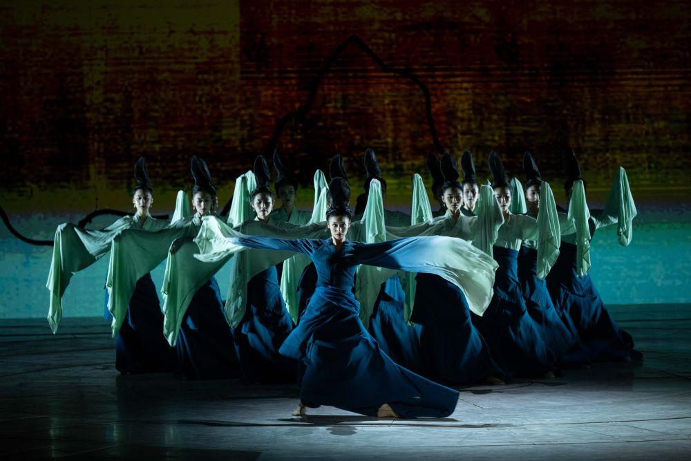 這是舞蹈詩(shī)劇《只此青綠》的演出劇照(2024年7月18日攝)。《只此青綠》采用平行空間的敘事方式,從故宮博物院青年研究員的“展卷人”視角出發(fā),講述北宋著名畫(huà)家王希孟創(chuàng)作《千里江山圖》的故事。該劇連續(xù)3年穩(wěn)居中國(guó)舞劇票房榜首,全國(guó)巡演超800場(chǎng),赴多個(gè)國(guó)家和地區(qū)演出50余場(chǎng),成為傳統(tǒng)文化創(chuàng)新表達(dá)、中國(guó)藝術(shù)國(guó)際表達(dá)的典范之作。