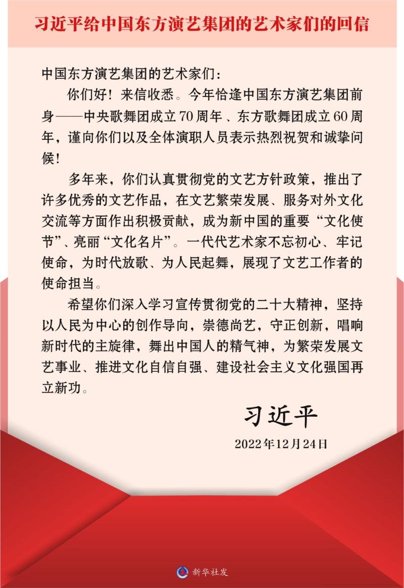 2022年,習(xí)近平總書(shū)記給中國(guó)東方演藝集團(tuán)的藝術(shù)家們回信,勉勵(lì)他們?yōu)榻ㄔO(shè)社會(huì)主義文化強(qiáng)國(guó)再立新功。