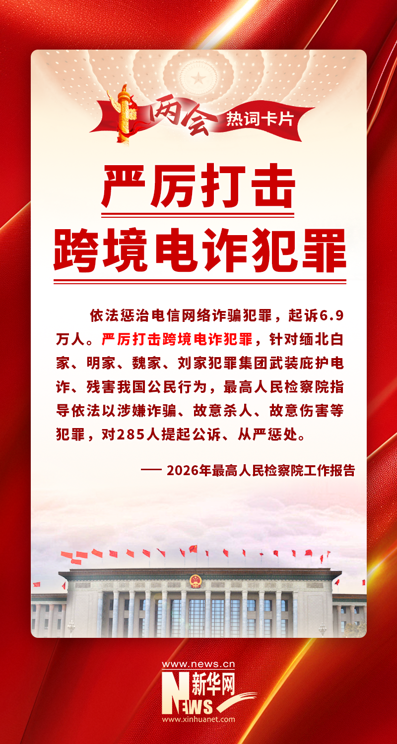 最高人民檢察院法律政策研究室主任、工作報(bào)告起草組負(fù)責(zé)人楊劍波:電詐犯罪無(wú)孔不入,人民群眾深惡痛絕。2025年,檢察機(jī)關(guān)協(xié)同有關(guān)部門共起訴電詐犯罪6.9萬(wàn)人,并對(duì)緬北“四大家族”285人提起公訴。目前,緬北“四大家族”犯罪集團(tuán)案已全部進(jìn)入司法程序,緬北明家、白家犯罪集團(tuán)16人被判處死刑立即執(zhí)行。