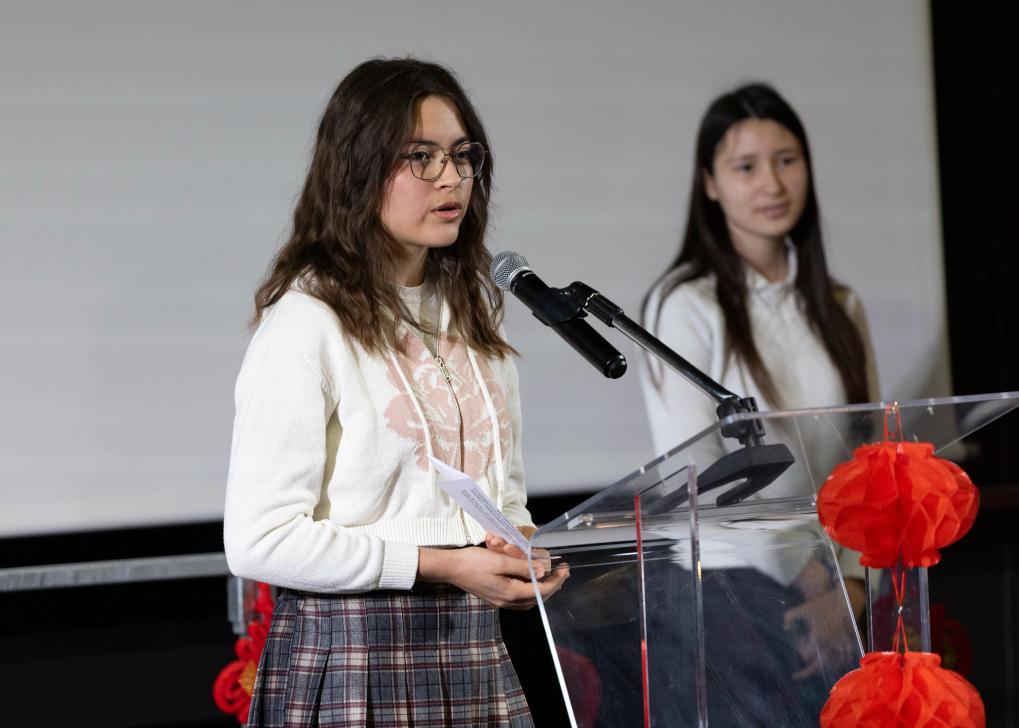 3月12日,在法國(guó)普羅旺斯-阿爾卑斯-藍(lán)色海岸大區(qū)國(guó)際學(xué)校,中國(guó)駐馬賽總領(lǐng)館向?qū)W校轉(zhuǎn)交習(xí)近平主席復(fù)信。這是該校中文班學(xué)生伊西絲在活動(dòng)現(xiàn)場(chǎng)發(fā)言。新華社記者 鄔惠我 攝