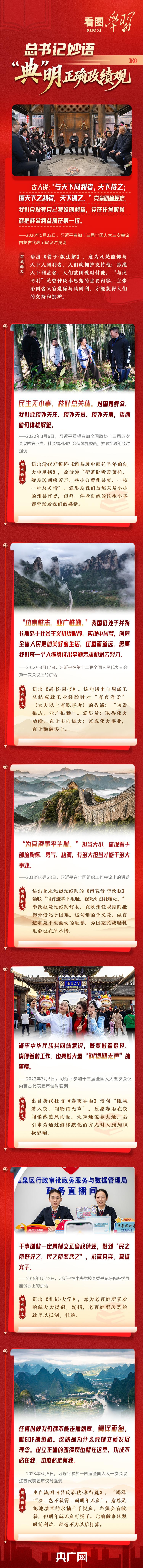 從殷殷囑托“民生無小事,枝葉總關(guān)情”“功崇惟志,業(yè)廣惟勤”,到悉心叮囑要做好“潤物細(xì)無聲”的“潛績”,再到嚴(yán)肅指出任何時候都不能走急就章、竭澤而漁……總書記曾多次引經(jīng)據(jù)典、援古論今,深刻闡釋什么是正確政績觀、怎樣踐行正確政績觀,意蘊深遠(yuǎn),發(fā)人深省。