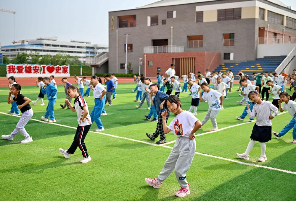 2024年5月21日,雄安史家胡同小學(xué)學(xué)生在操場(chǎng)上做操。按照統(tǒng)一安排,北京四中、北京史家胡同小學(xué)、北京北海幼兒園等知名校(園)長在雄安新區(qū)設(shè)立領(lǐng)航名校長工作室,推動(dòng)優(yōu)質(zhì)中小學(xué)基礎(chǔ)教育資源同雄安實(shí)現(xiàn)共享。