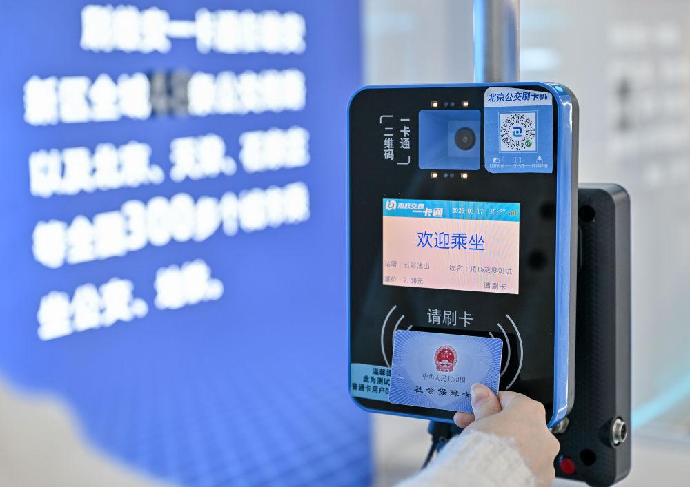 2026年3月17日,雄安一卡通體驗(yàn)館的工作人員演示刷社??ǔ俗卉嚒?/span>