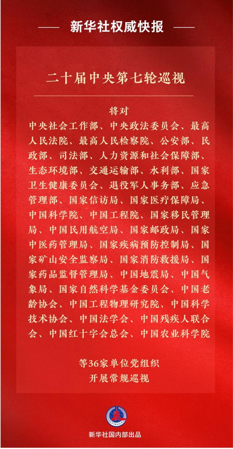 新華社北京4月8日電 經(jīng)黨中央批準(zhǔn),二十屆中央第七輪巡視將對(duì)中央社會(huì)工作部、中央政法委員會(huì)、最高人民法院、最高人民檢察院、公安部、民政部、司法部、人力資源和社會(huì)保障部、生態(tài)環(huán)境部、交通運(yùn)輸部、水利部、國家衛(wèi)生健康委員會(huì)、退役軍人事務(wù)部、應(yīng)急管理部、國家信訪局、國家醫(yī)療保障局、中國科學(xué)院、中國工程院、國家移民管理局、中國民用航空局、國家郵政局、國家中醫(yī)藥管理局、國家疾病預(yù)防控制局、國家礦山安全監(jiān)察局、國家消防救援局、國家藥品監(jiān)督管理局、中國地震局、中國氣象局、國家自然科學(xué)基金委員會(huì)、中國老齡協(xié)會(huì)、中國工程物理研究院、中國科學(xué)技術(shù)協(xié)會(huì)、中國法學(xué)會(huì)、中國殘疾人聯(lián)合會(huì)、中國紅十字會(huì)總會(huì)、中國農(nóng)業(yè)科學(xué)院等36家單位黨組織開展常規(guī)巡視。