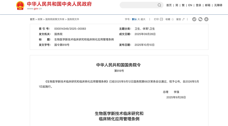 我國首部專門規(guī)范生物醫(yī)學(xué)新技術(shù)臨床研究的行政法規(guī)《生物醫(yī)學(xué)新技術(shù)臨床研究和臨床轉(zhuǎn)化應(yīng)用管理條例》(國務(wù)院令第818號,簡稱“818號令”)(以下簡稱《條例》)將于2026年5月1日正式施行。新規(guī)明確禁止在臨床研究階段以任何形式向受試者收取費用,并首次將醫(yī)療機構(gòu)及醫(yī)務(wù)人員列為直接責任主體,標志著干細胞、免疫細胞等前沿療法告別“灰色操作”,全面進入依法監(jiān)管新階段。