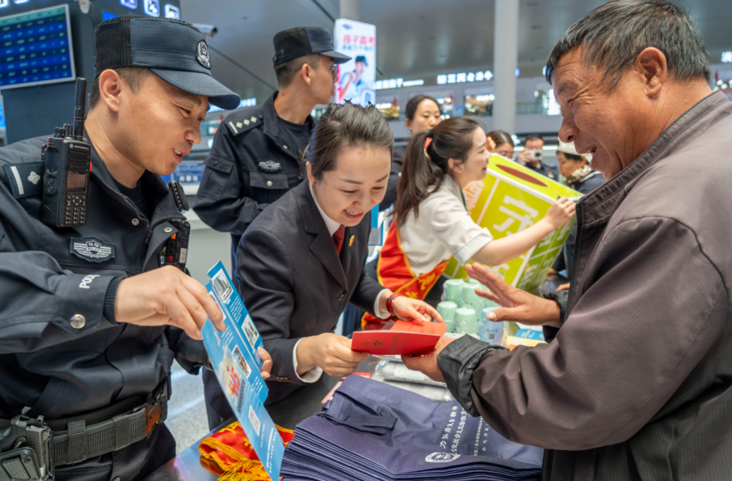 在第十一個全民國家安全教育日來臨之際,4月14日,烏魯木齊鐵路公安處烏魯木齊站派出所聯(lián)合烏魯木齊經(jīng)濟技術(shù)開發(fā)區(qū)(頭屯河區(qū))司法局高鐵司法所、鐵路運輸檢察院,在烏魯木齊站候車室開展鐵路安全普法教育活動?;顒蝇F(xiàn)場,普法志愿者通過普法宣講、典型案例警示、安全知識有獎問答、宣傳資料發(fā)放、現(xiàn)場法律咨詢等多種形式,向群眾普及國家安全、鐵路護路、出行安全等法律法規(guī)知識,有效提升群眾法治意識與安全防護能力,營造“國家安全、人人有責”的濃厚氛圍。
