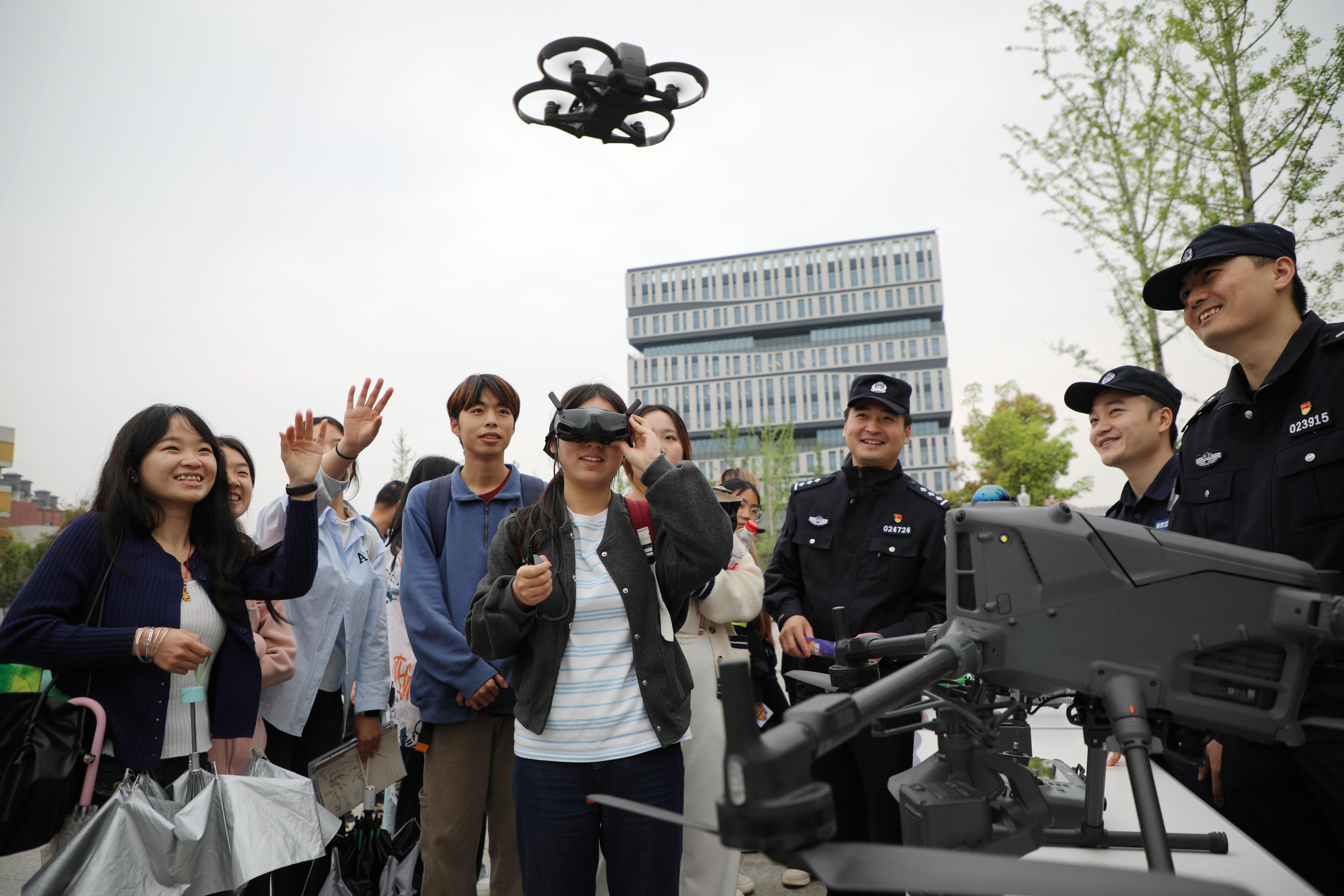 圖為4月15日,民警走進(jìn)江西財(cái)經(jīng)職業(yè)學(xué)院讓學(xué)生體驗(yàn)無人機(jī)等警用裝備。