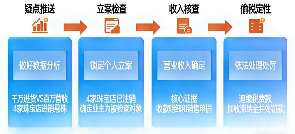 檢查人員依托稅收大數(shù)據(jù)分析,比對(duì)該珠寶店的發(fā)票數(shù)據(jù)和自行申報(bào)信息,發(fā)現(xiàn)其2022年至2024年共計(jì)接收上游兩家公司金銀珠寶首飾發(fā)票685份,發(fā)票金額合計(jì)8100.56萬元,但同期申報(bào)的增值稅應(yīng)稅收入僅467.35萬元,消費(fèi)稅應(yīng)稅收入463.86萬元。八千多萬的進(jìn)貨成本,卻只申報(bào)了不到五百萬的銷售收入,有違經(jīng)營(yíng)常理。
