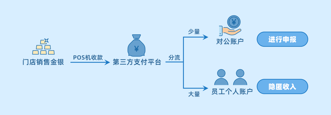 經(jīng)查實,兩家公司共在第三方支付平臺上登記了3個商戶號,除對公賬戶有收款外,另外兩個商戶號均為墾泰商貿(mào)兩家成都分公司的員工的個人賬戶,收款金額較對公賬戶更為巨大。檢查人員隨即依法約談了兩名員工,兩人均承認(rèn)賬戶收款資金實際為公司銷售金銀飾品取得的銷售貨款。