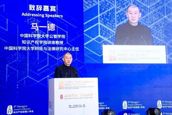 1月24日至25日,2026年知識(shí)產(chǎn)權(quán)戰(zhàn)略發(fā)展新年論壇暨知識(shí)產(chǎn)權(quán)經(jīng)理人年會(huì)在北京舉行。在開(kāi)幕式上,中國(guó)科學(xué)院大學(xué)公共政策與管理學(xué)院、知識(shí)產(chǎn)權(quán)學(xué)院講席教授、中國(guó)科學(xué)院大學(xué)科技與法律研究中心主任馬一德發(fā)表致辭。他在回顧并反思知識(shí)產(chǎn)權(quán)學(xué)科與制度所面臨的深刻挑戰(zhàn)后,呼吁當(dāng)代中國(guó)知識(shí)產(chǎn)權(quán)人努力繼承和發(fā)揚(yáng)中國(guó)知識(shí)產(chǎn)權(quán)學(xué)科奠基人劉春田教授的擔(dān)當(dāng)精神、學(xué)術(shù)風(fēng)骨與責(zé)任意識(shí)。