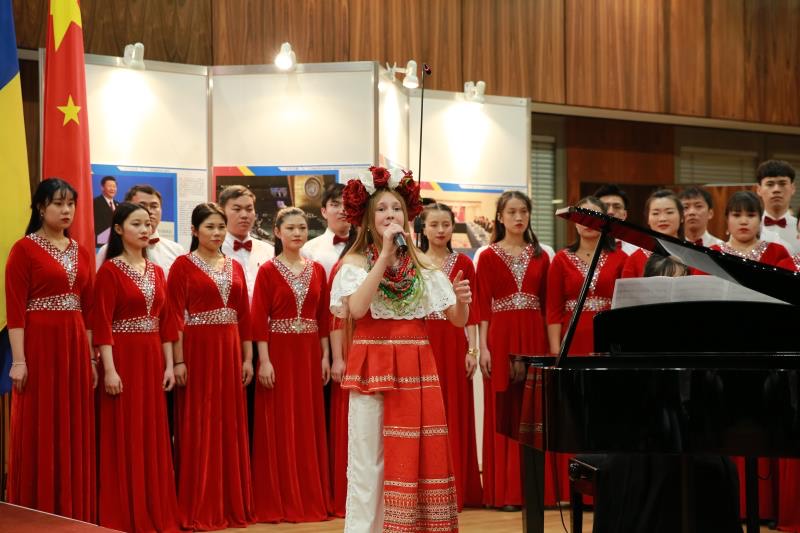 招待會(huì)在中國留學(xué)生藝術(shù)團(tuán)合唱隊(duì)用中烏雙語演唱的兩國國歌聲中拉開帷幕,現(xiàn)場(chǎng)觀眾對(duì)此報(bào)以熱烈掌聲,從一開始就把招待會(huì)氣氛推向了高潮。