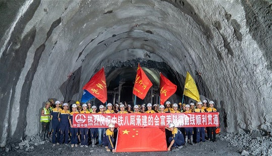 7月23日,中國中鐵八局員工在老撾北部烏多姆賽省貫通會富萊隧道后合影。 中老鐵路全線控制性工程——會富萊隧道23日貫通,為后續(xù)架梁鋪軌施工、實(shí)現(xiàn)2021年全線通車目標(biāo)創(chuàng)造條件。 新華社發(fā)(中鐵八局供圖)