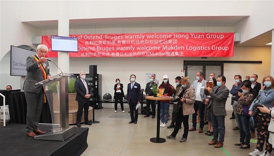 9月24日,在比利時奧斯坦德的奧斯坦德—布魯日機場,比利時西佛蘭德省省長卡爾·德卡呂韋在儀式上致辭。 比利時奧斯坦德—布魯日機場24日舉行隆重儀式,歡迎北京宏遠集團的貨運航班正式入駐。這標志著連接該機場與中國多地的“空中絲綢之路”新航線正式開通。 新華社記者 鄭煥松 攝