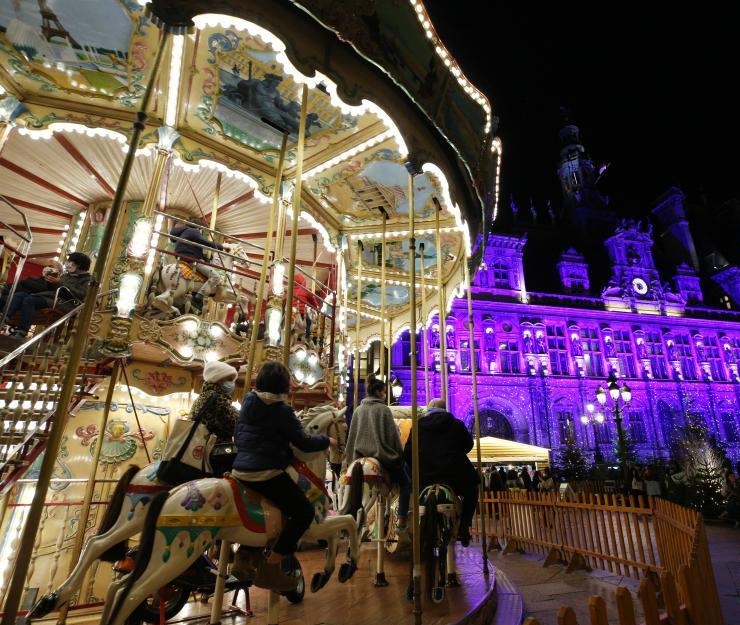 12月15日,在法國(guó)巴黎市政廳廣場(chǎng),人們?cè)谙俺俗D(zhuǎn)木馬。為迎接即將到來(lái)的圣誕和新年,市政廳廣場(chǎng)設(shè)置圣誕裝飾和旋轉(zhuǎn)木馬。