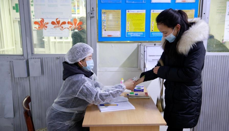 12月23日,在吉爾吉斯斯坦比什凱克,一名市民(右)到一家醫(yī)藥中心問診時接受體溫檢測。