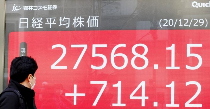 12月29日,行人經(jīng)過日本東京一處電子股指顯示屏。