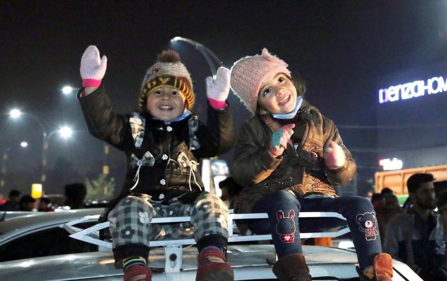 1月1日,兩名兒童在巴基斯坦拉瓦爾品第的新年慶?;顒由险障?。