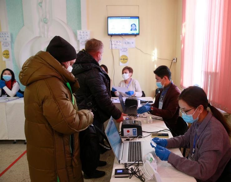 1月10日,在吉爾吉斯斯坦首都比什凱克,投票站工作人員驗證選民身份。