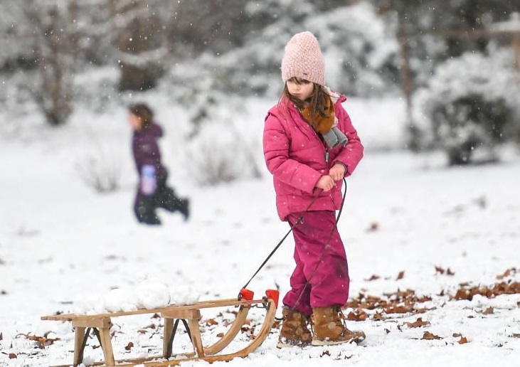 1月17日,在德國法蘭克福,一名孩子在一處公園的雪地上玩耍。
