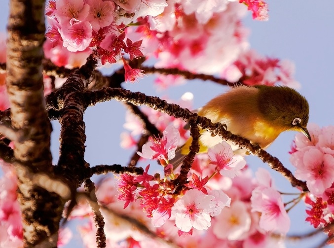 當(dāng)?shù)貢r(shí)間2月17日,日本東京,早春的氣息漸濃,櫻花盛開(kāi),鳥(niǎo)兒在枝頭嬉戲。(圖片來(lái)源:東方IC)