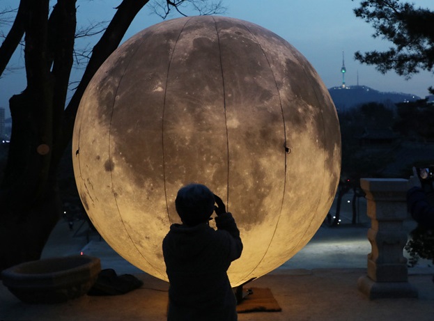 當?shù)貢r間2月24日,韓國首爾,為迎接正月十五到來,昌慶宮內(nèi)擺放巨型月亮,吸引游客前來參觀拍照。(圖片來源:東方IC)