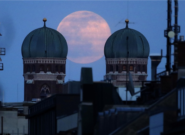 人民網(wǎng)訊 當(dāng)?shù)貢r間3月28日,德國慕尼黑,滿月從圣母教堂后升起。