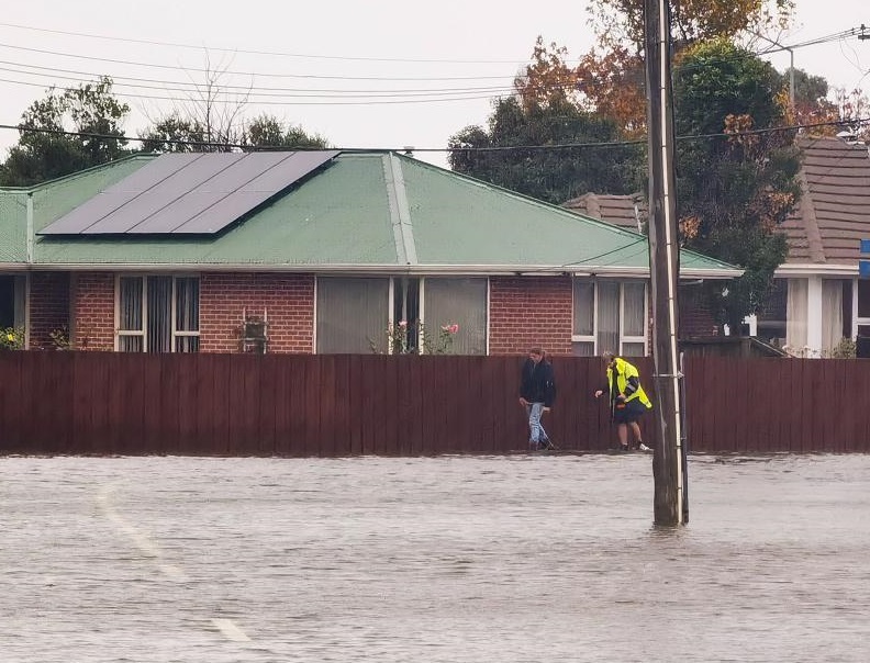 5月30日,兩名行人涉水通過新西蘭克賴斯特徹奇的一條漫水的街道。