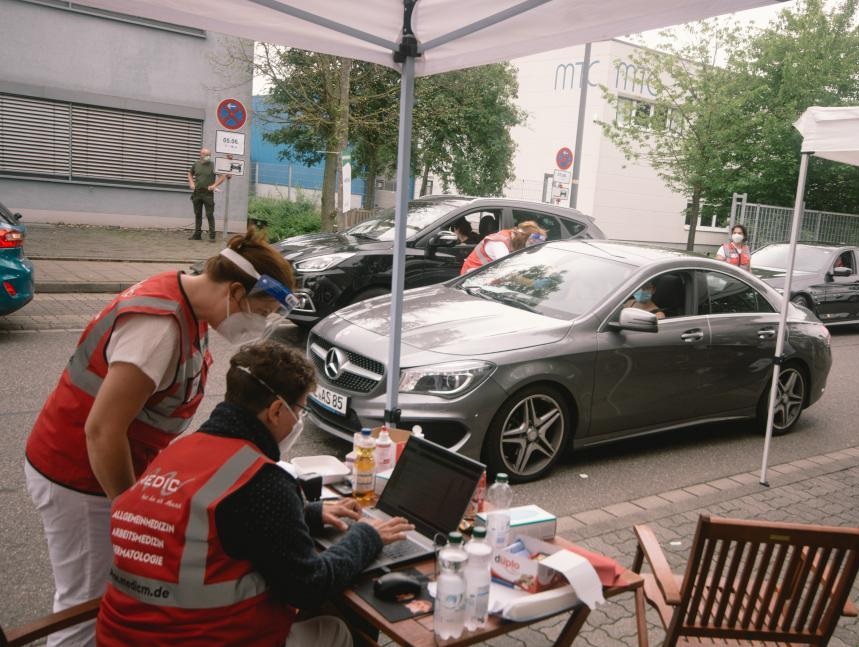 6月5日,德國(guó)梅爾布施的工作人員在一處“得來(lái)速”式新冠疫苗接種點(diǎn)工作。